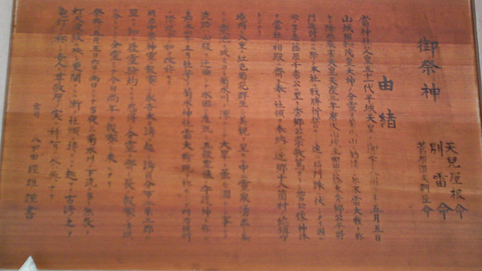 「当神社は人皇五十一代平城天皇の御宇大同二年五月五日山城国加茂皇大神の分霊を菊水山に勧請し、爾来雷大権と称せり。