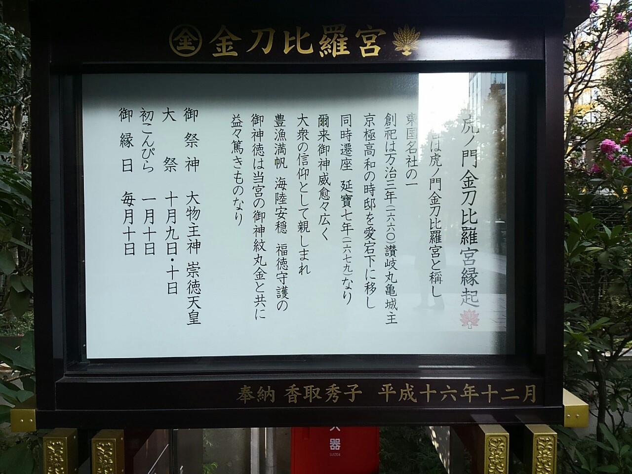 創建年月は不明である古くは金刀比羅宮と書き金毘羅、金比羅大権現と称した。