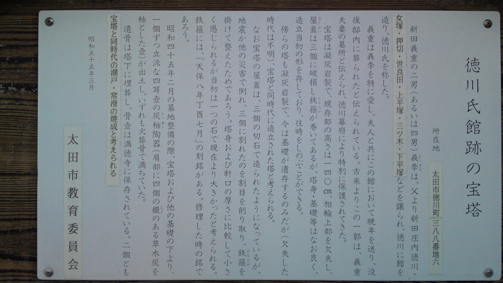 「八坂神社の創建は明らかでないが、縁起によれば新田氏代々の崇敬社であり、織田信長も同社を崇拝し社殿を修造したという。また尾張国(愛知県)津島天王社の分霊を移したとも伝える。これは世良田政義の娘と南朝の王子尹良親王との間に出生した良王が、津島天王社の神主となったという故事によるものであろう。