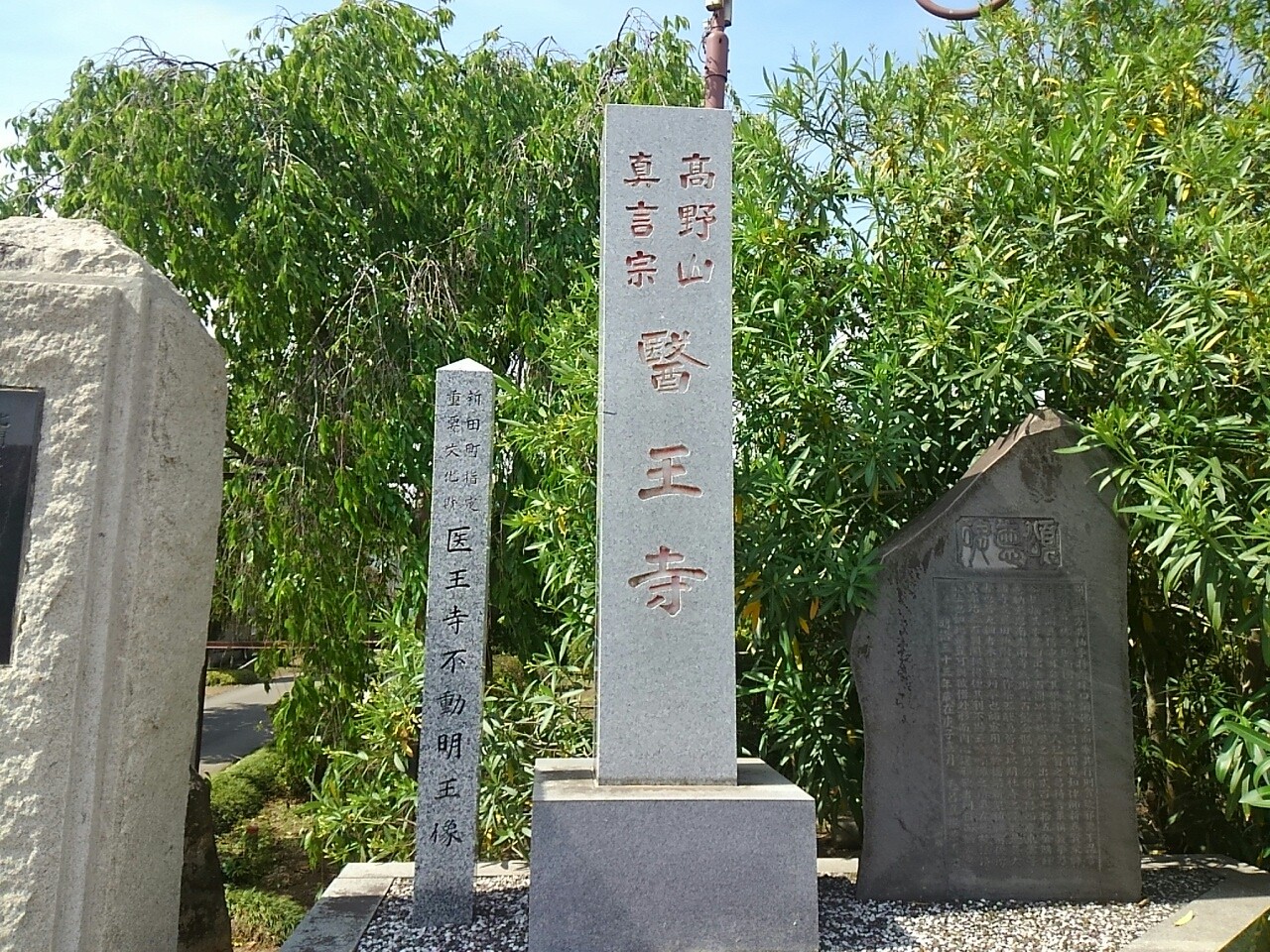 不動明王は、万延元年(1860)に四国霊場四十八番札所西林寺から移したといい、通称黄金身代わり不動尊として今日も人々の信仰があつい。そのため、醫王寺は昭和六十二年(1987)9月に指定された北関東三十六不動尊霊場の第十番である。また、観音堂はかつて宝永五年(1708)4月に堯観によって邑楽・新田・山田三郡にまたがる東上州三十三番札所が創設されたが、醫王寺はその二十一番札所である。」